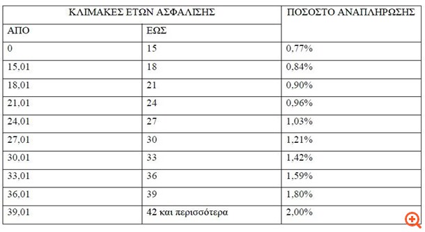 Το ποσοστό αναπλήρωσης για κάθε έτος ασφάλισης ανά κλίμακα ετών, αντιστοιχεί στο ποσοστό που αναγράφεται στην τρίτη στήλη του πίνακα.