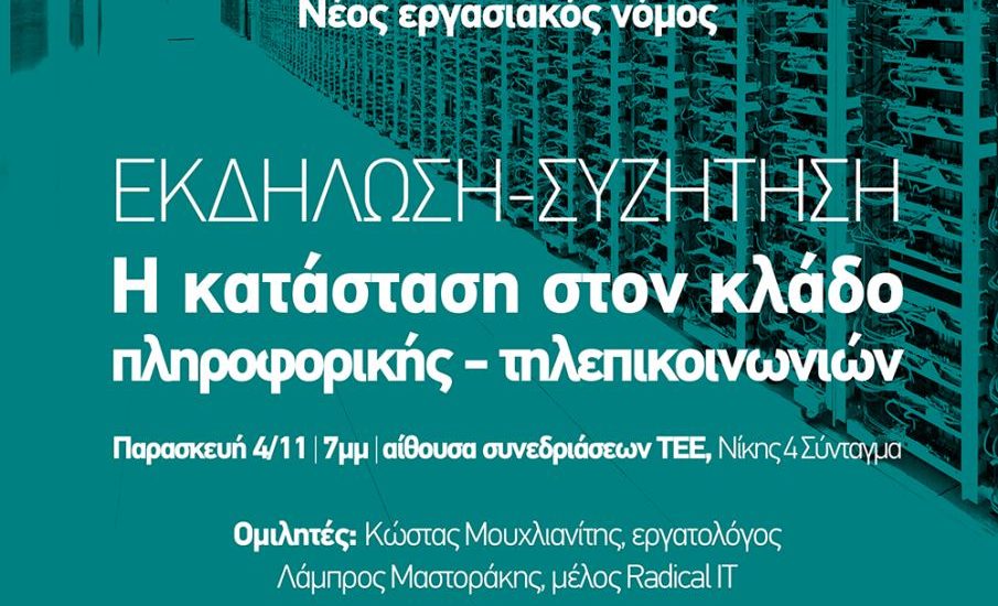 Ομιλητές: Κώστας Μουχλιανίτης, εργατολόγος, Λάμπρος Μαστοράκης, μέλος Radical I.T.